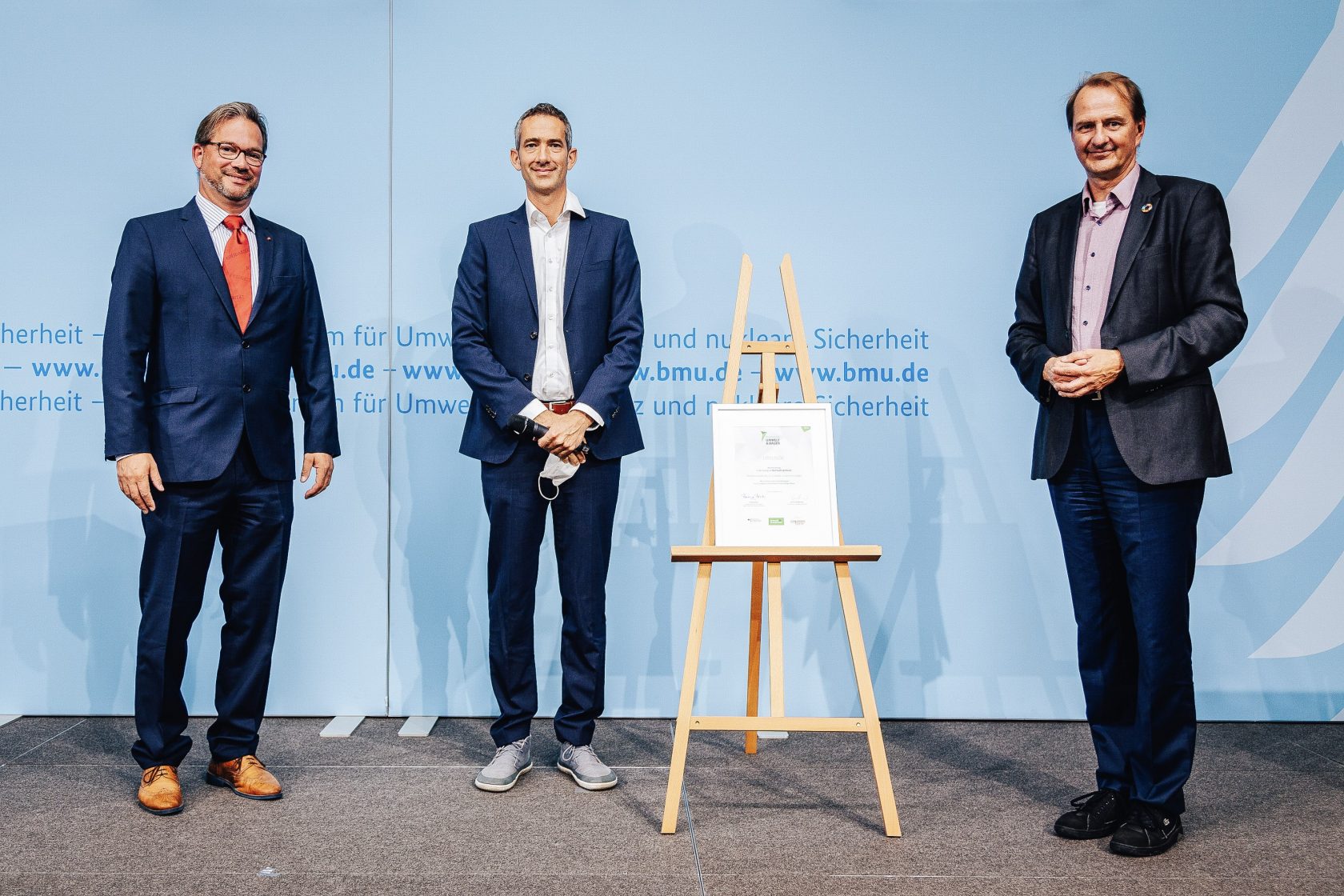 v.l.n.r. Florian Pronold (Parlamentarischer Staatssekretär, BMU), Prof. Dirk Messner (UBA-Präsident) und Philip Leube (Büropartner F64 Architekten) bei der feierlichen Preisverleihung in Berlin.