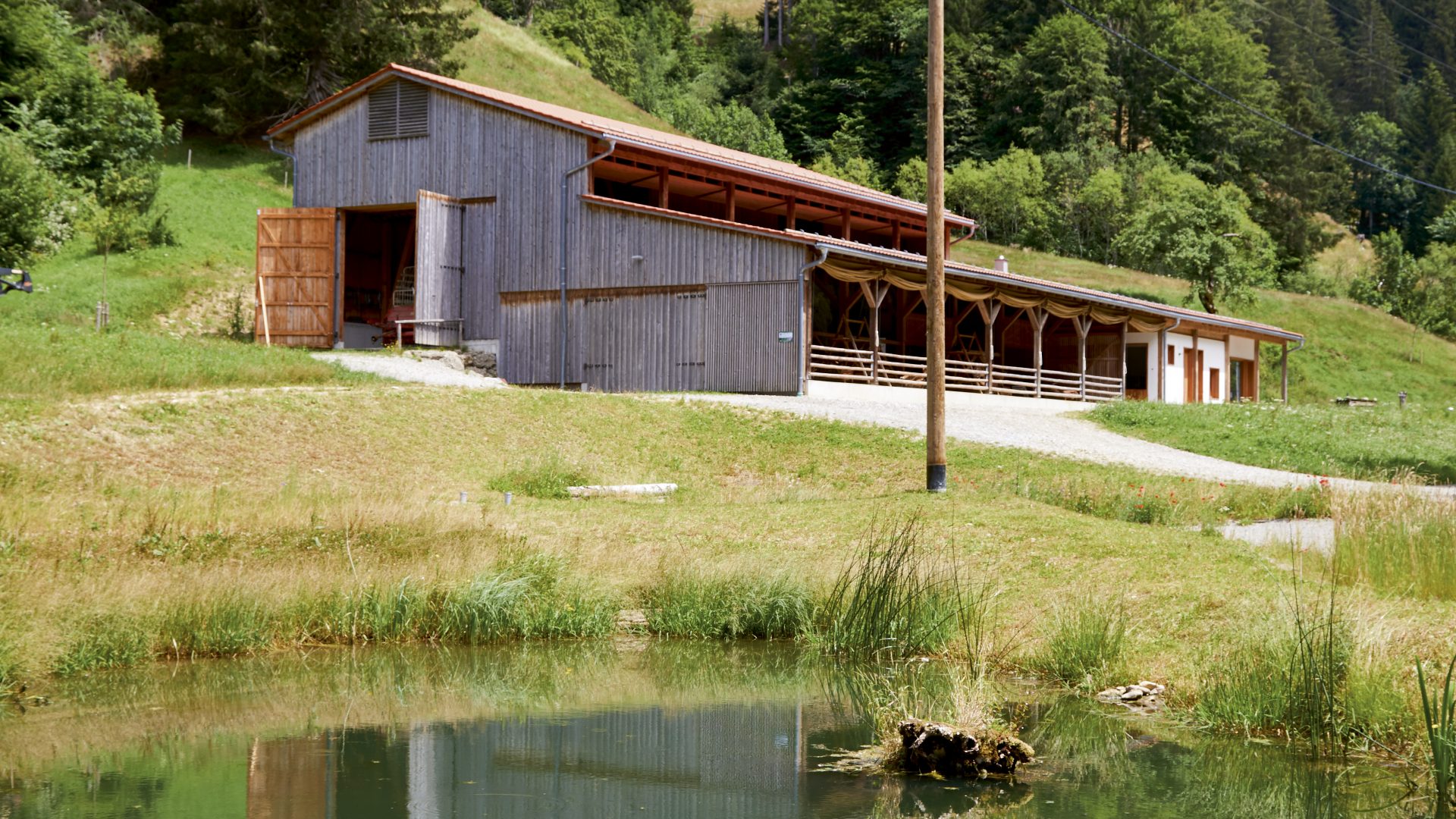 Ortsübliche Bauweise – das heißt entweder: Der neue Stall ist in den bestehenden Einfirsthof integriert, üblicher weise im Erdgeschoß unter der Bergehalle. Oder: Der Stall steht als Halle neben den bestehenden Bauten, in der Regel ein Bau körper mit Satteldach und einer Firsthöhe um acht Meter. Schließlich ist eine Mischform anzutreffen: Der Stall schließt als flacher Bau an eine hohe Bergehalle etwa halbhoch an.